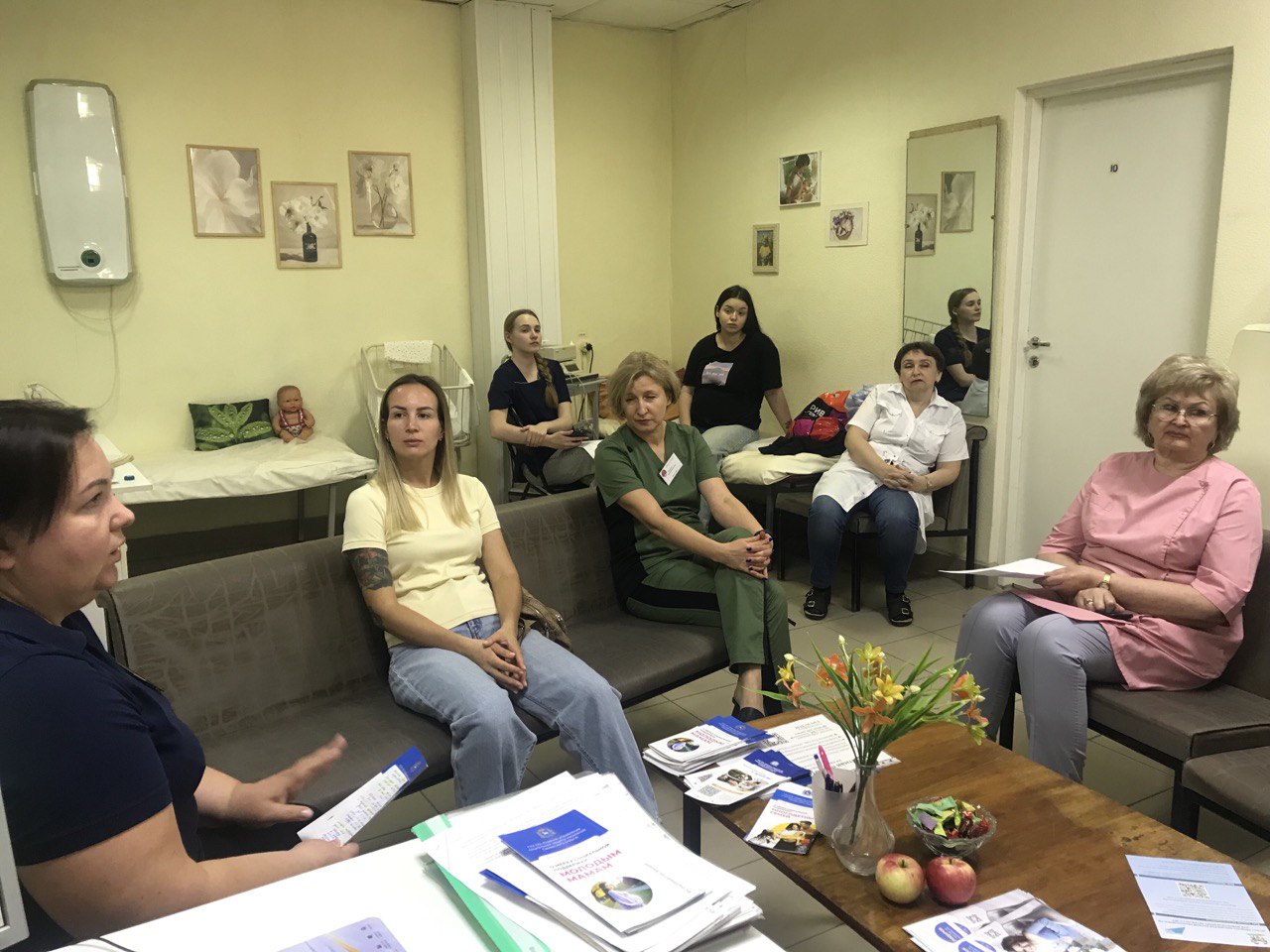 На встрече сотрудники социальной защиты поделились интересной информацией с мед.работниками и пациентами, которые готовятся стать мамой, о мерах социальной поддержки семей с детьми, молодым мамам, студенческим семьям, многодетным семьям.